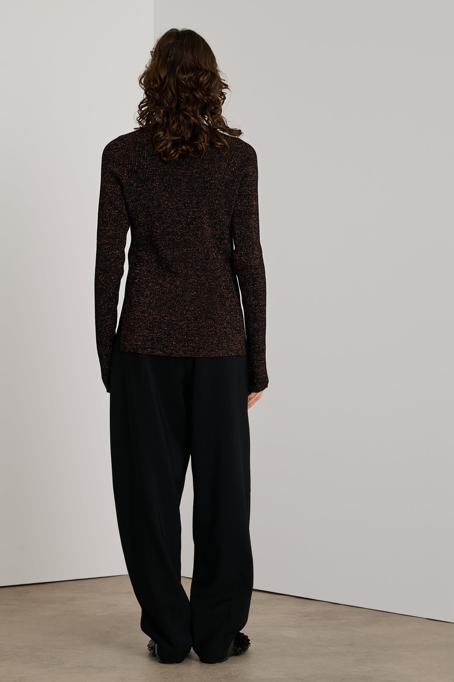 VERONA is a ribbed jumper knitted from merino wool yarn, mixed with lurex for an iridescent effect. It has a straight, close-fitting cut and a round neckline.